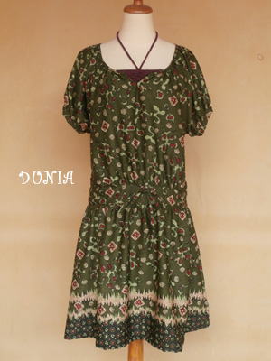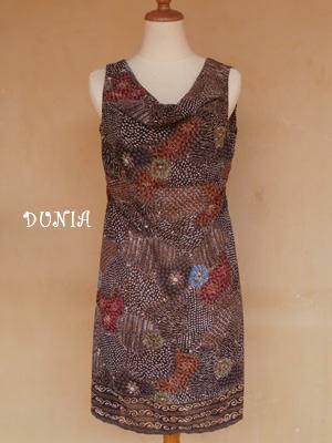 テロンと垂れた首元がポイントです。つるっとした涼しい素材のワンピース。背中のラインが綺麗に見えるように、すこし広めにあけました。こちらもバンドゥン・バティックです。DUNIA〜インドネシア衣類&雑貨〜http://www.dunia-bali.com/index_jp.html
