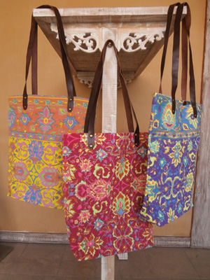 可愛いプリントのトートバッグ3色が入りました!イエローとパープルはキャンバス生地、真ん中のレッドはコットン生地です。持ち手は本皮、たっぷり入るトートバッグです!DUNIA〜インドネシア衣類&雑貨〜http://www.dunia-bali.com/index_jp.html