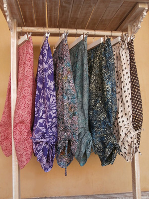 新作サルエルパンツの残り2色が出来上がりました。<ブルー><オレンジ>前身ごろのウエストは幅広ベルトになっていて、上部のみゴムが入っています。洗濯時にくるりと捩れないように、ゴムは縫い付けてあります。後ろ身ごろのウエストには、前身ごろの1,5倍幅のゴムが入っていてシャーリングになっています。脇をペタンとさせると、こんなシルエットに。裾の部分はこんな感じです。左右にポケット付き!DUNIA〜インドネシア衣類&雑貨〜http://www.dunia-bali.com/index_jp.html
