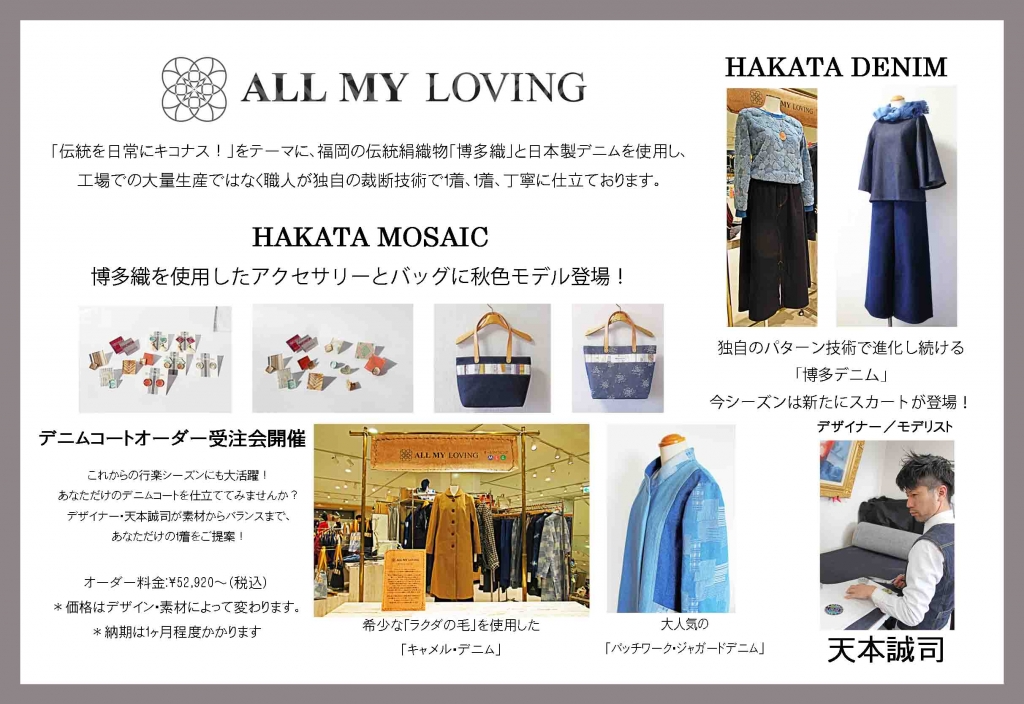 JUGEMテーマ:DENIM COUTURE 大阪・阪神梅田本店で現在開催中の「第4回 デニム博」 いよいよ、本日は最終日! 昨日に引き続き、昨日も会場は大賑わい。 沢山の素敵なお客様との出会いに恵まれました♪ デザイン性の高いALL MY LOVINGのcollection lineの商品も大人気! デザイナーの感性と表現の詰まった服がお客様に気に入っていただけるのは本当に嬉しいです。 HAKATAMOSAICのバッグも大人気です。 「親孝行」・「厄除け」・「家内安全...