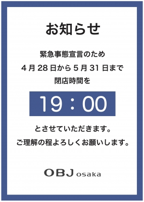 こんにちは。 平素よりOBJ osakaにご愛顧賜り誠にありがとうございます。 新型コロナウイルス感染症拡大に伴う、 緊急事態宣言の発令を受け、 当店の営業時間を下記の日程において 変更させていただきます。 誠に勝手ではありますが、 お客様の安全と健康に配慮させていただいた上での 判断でございます。 何卒ご了承くださいますよう宜しくお願い申し上げます。 ...
