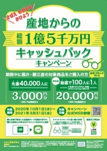 JUGEMテーマ:メガネ めがねミュージアムを運営する(一社)福井県眼鏡協会は鯖江市と協力し、 2020年10月01日(めがねの日!!)より、福井県産の眼鏡を取り扱う全国の対象小売店にて キャッシュバックキャンペーンを実施します! もちろん、オプティコ モダも対象店舗です。 めがねフレームの一大産地である福井県鯖江市。 国産めがねフレームの約96%のシェアを持つ産地福井県の中心にあり、その技術・品質力は世界で認められています。 ...