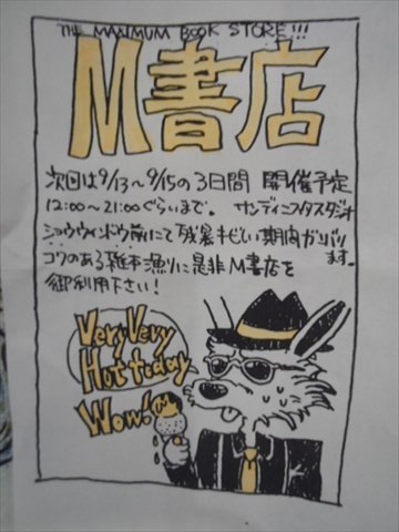 JUGEMテーマ:ビンテージ 古着こんばんわ!埼玉県所沢市のカルチャーショップSANDINISTA! STUDIOの会長です!ささ、皆様お待たせしました!空前絶後の古本屋「M書店」第6陣開催されましたよー!開催間もなく徐々にですがお客様も集まってきておりました!オーナM氏渾身の1撃、今回は段ボール看板も設置です。これは段ボールの凹凸感に色がのって、画像ではどうしても映すことのできない絶妙な温度刊がでております。商品構成も相変わらずの安心コーリティ。今回は面出し陳列も多めにし、お客様に見やすいよう工夫しております。段ボ...