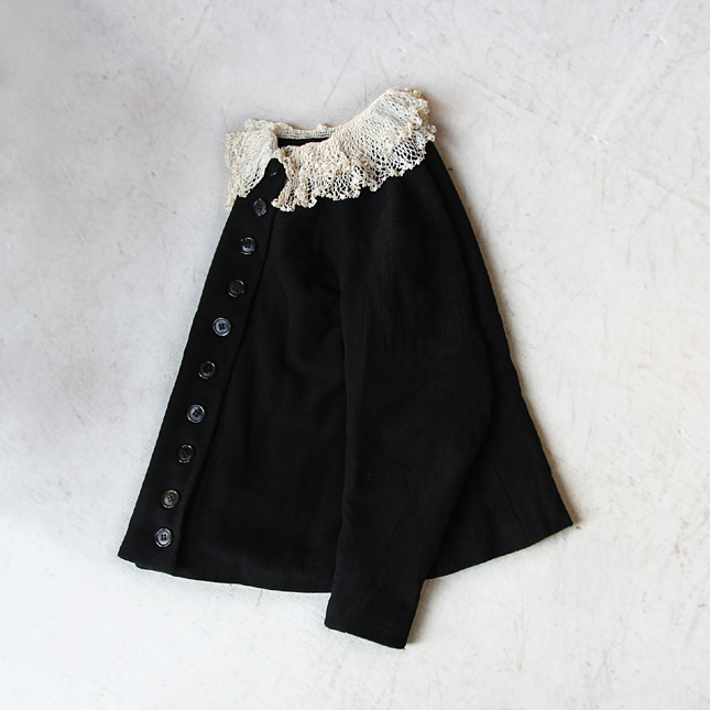 JUGEMテーマ:ビンテージ 古着JUGEMテーマ:古着*大好き20-30's Lace collar wool jacket }http://stlow.net/?pid=703777481920-30年代頃の古いウール素材のレース襟ジャケット。かぎ編みで作られたレース襟に肩ヨークでの切替、前ボタンがきちんと並んだデザインはかしこまった席にも活用できそうです。袖のデザインはクレセント(三日月)スリーヴとなっており、ゆったりとしたデザイン。肘のみシャーリングが施してある、凝ったつくりとなっています。正面からのシルエットはシンプルですっきりとしていますが、サイドから...