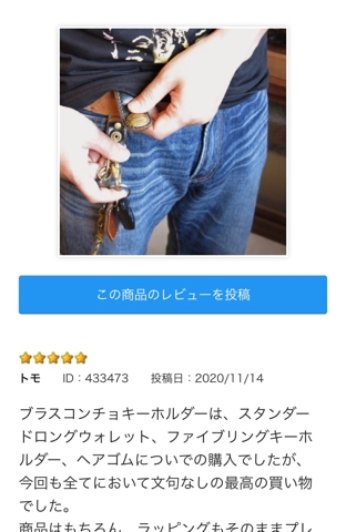 ブラスコンチョキーホルダーのレビューをいただきました。 商品と一緒にお届けしているオリジナルポストカードも、玄関に飾ってくれているとは非常に嬉しいです。唯一の不満まで書いていただきありがとうございます! ブラスコンチョキーホルダーは、スタンダードロングウォレット、ファイブリングキーホルダー、ヘアゴムについでの購入でしたが、今回も全てにおいて文句なしの最高の買い物でした。 商品はもちろん、ラッピングもそのままプレゼントとして渡されても嬉しくなるようなラッピ...