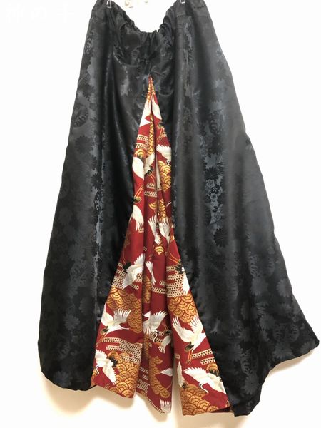 大きいサイズの袴風ワイドパンツをメンズサイズでお作りしました。 オーダーありがとうございます。 お客様のご希望された鯉ジャガード生地(黒)を外側に使用して、 内側はこちらに合う様に選んでお作りしました。 和太鼓衣装としてご活用頂けるとのこと。 最初お届けすると、お客様にはサイズ感が大きかったようで、 詰めて再度返送させて頂きました。 お直しの際、ウエストに結ぶ紐を取りつけるのをご希望されたので、 ...