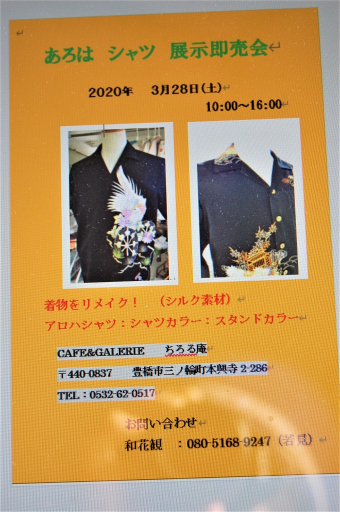 JUGEMテーマ:おすすめメンズファッション 【3月28日】のみです 古い着物を解いてアロハシャツにリメイクしています。 アロハシャツ:スタンドカラー:シャツカラー 展示会即売会の案内!! 2020年 3月 28日(土曜日) 場所 : 豊橋市三ノ輪町本興寺2-286 CAFE&GALERIE ちろる庵(精文館前) TEL : 0532I−62−0517 時間 :9:00〜16:00 次回の展示即売...