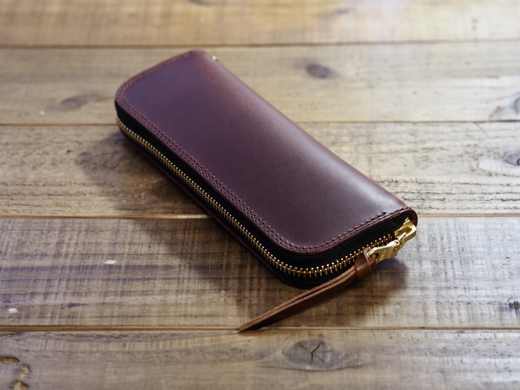 【コードバンの革財布「ラウンドファスナーウォレットLTD」/カスタムオーダー】 今回ご紹介しますのは、先日納品致しましたラウンドファスナーウォレットLTDのカスタムオーダーです。 日本が誇る「新喜皮革」の水染コードバンは非常に上品な艶と色ムラが魅力です。 ファスナーはTALON。 コットンのファスナーテープ(布の部分)が革にマッチします。 ウォレットロープ用のDカンを追加。 真鍮製で、革と共に経年変化も楽しめ...