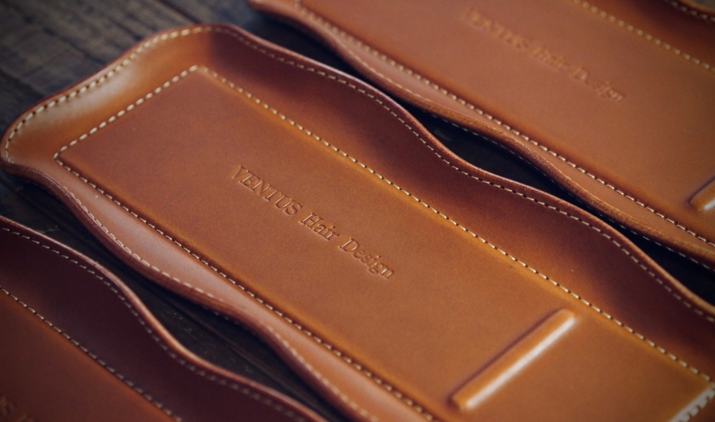 【革のキャッシュトレイとメガネ&アクセサリートレイ】 今回ご紹介しますのは先日納品いたしましたキャッシュトレイとメガネ&アクセサリートレイです。 色はキャッシュトレイでは一番人気の「タン」 鹿児島の美容室「VENTUS Hair Design」様の店名を入れております。 メガネ&アクセサリートレイ こちらも同色のタンで制作いたしました。 店名が入っている左の部分がメガネスペース、仕切りの右側がアクセサリースペースとなります。 ...