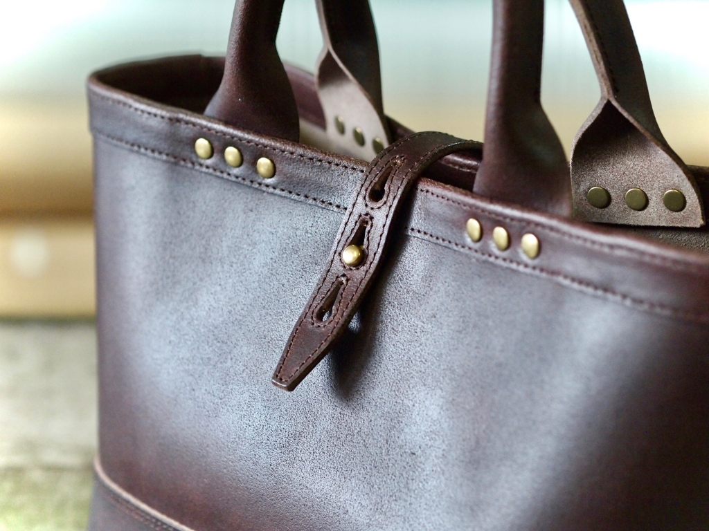 【ダークブラウンのミニトート/カスタムオーダー】 今回ご紹介しますのは、先日納品いたしましたダークブラウンのミニトートのカスタムオーダーです。 カスタム内容は以下の通りです。 ギボシ留めストラップ ステッチを同色系へ変更 内側にDカン×2 令和刻印 ギボシ留めストラップを外すとこのようになります。 真鍮のギボシが目を引きます。 ギボシの上には「令和元年製造刻印」を入れました。 ストラップに隠れるのであ...