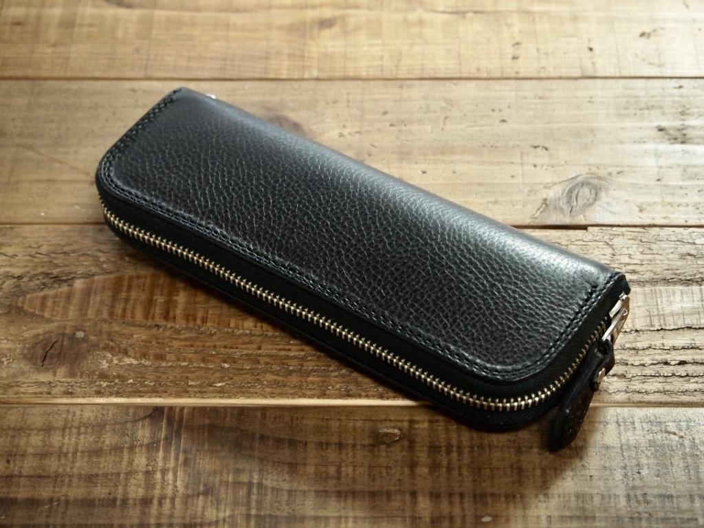 【黒革のペンケース/カスタムオーダー】 本日ご紹介いたしますのはペンケースMのカスタムオーダーです。 外装はシボ(細かいシワ)が魅力的なイタリアの革(アリゾナ)を使用。 ファスナーもYKKからTALONのブラック/ニッケルに変更しております。 ステッチも合わせてブラックで統一。 渋めのカスタムとなっております。 ファスナーを開けると鮮烈な赤! 赤いプルアップレザーをセレクト。 赤い革には他にも外装と同じシボ革などもありましたが、外装と内装で質感の違いをご希...