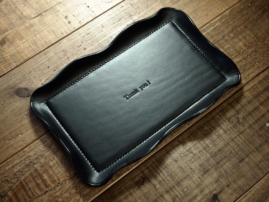【レザーキャッシュトレイコレクション】 今回は久しぶりに「キャッシュトレイコレクション」として名入れ事例のご紹介をしたいと思います。 上の写真はステッチを革と同色の「黒」に変更。※通常はベージュのステッチです。 オプションの2行入れ。 あまり長い名前は一行で入れる事ができませんので、その場合は2行での対応となります。 数字を入れることも可能です。 写真の革は「サドルレザー」 ...