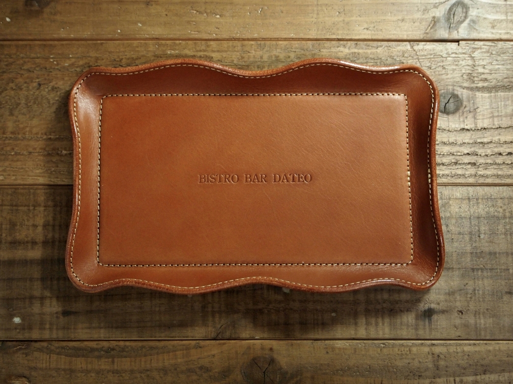 今回はレザーキャッシュトレイ(マネートレイ)のご感想が届きましたのでご紹介します。 「BISTRO BAR DATEO」と店名を刻印いたしました。 このアルファベット刻印であれば、名入れは只今サービスで入れることができます。 お客様からは「2列で入れるか」「全て大文字にするか小文字も使うか」等をご相談の上、全て大文字一列に決定いたしました。 読みやすさで言えば、頭のみ大文字で後は小文字「Bistro Bar Dateo」だと思いますが、 インパクトを出すと...