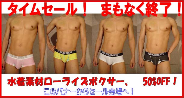 JUGEMテーマ:メンズアンダーウェア 日本製、東レの水着用生地のローライズボクサーパンツが、 半額 タイムセール このチャンスを逃すな! ↓ セール会場 ↓