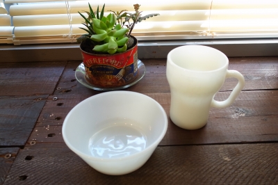 こんにちは。 今日も良い天気です。 そんな訳で13時より開店しております… それではこちら。 『Fireking』 ソーダマグと シリアルボールのセットです。 こんな日はキンキンに冷えた炭酸とフルーツを テラスでいただきたいものです。 ミルクホワイトの食器は中身がうっすらと透け 見た目も涼し気です。 コーラ?スプライト?? いや、今は100%オレンジジュースの気分です。 ヒビやカケなども無く状態もよろしいかと思います。 アイスだけではなく、 もちろんホットも...