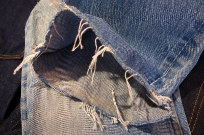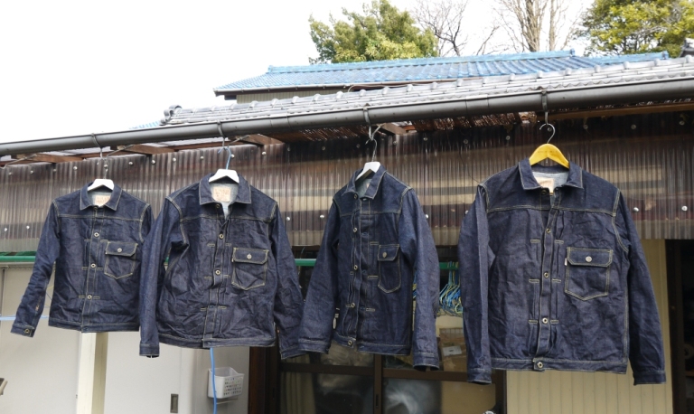 JUGEMテーマ:アメリカントラッド・アメカジ 完成した7506Gジャンの、洗い加工分4枚です。 キバタデニムを使っているので、かなり縮みました。 縮率10%以上です。 しかも縮む時に、向かって左によじれるんですね。 身頃も袖もよじれまくってます。 でも結果としてそれが立体裁断のように立体になり、着た時に身体にとてもしっくりきます。 しかもキバタデニムは伸び率も高く、きつい部分などはだんだん伸びてきて、自分の身体の形に合ってきます。 まさにシャツ感覚で着れる、デニムジャケットの完成で...