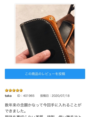 スタンダードウォレットのレビューをいただきました。ありがとうございます! 革質・縫製・使いやすさの点において、期待を裏切ることなく気に入っていただけたようです。エイジングを楽しみながら育ててください。 数年来の念願かなって今回手に入れることができました。 期待を裏切らない革質、縫製、使い勝手でとても満足してます。これから使い込んでいくことで、どのように経年変化していくか楽しみです。 スタンダードレザーロングウォレット / ブラック×キャメル(STANDAR...