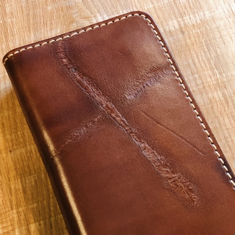 フォーマルすぎない大人のプレーンウォレットに新色追加です。 今回はガロンのラインナップでは珍しい、茶色のサドルレザーで製作しました。しかも貴重な焼き印入りです。