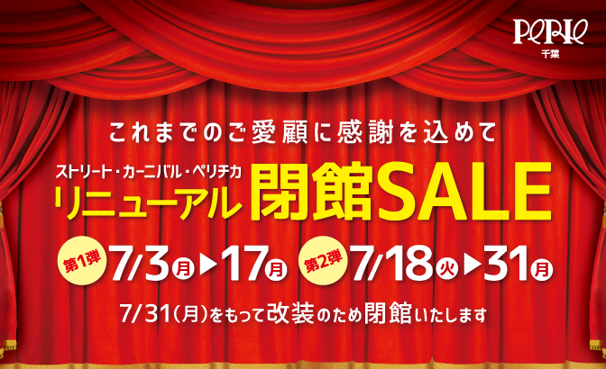 JUGEMテーマ:セール・お買い得・福袋 ペリエ千葉にてリニューアル閉店セール開催中!! ペリエ千葉ストリート・カーニバル・ペリチカはリニューアルのため7月31日(月)を持ちまして一時閉館致します。 これまでのご愛顧に感謝の気持ちを込めて、お買い得商品を多彩に取り揃えてセールを開催☆彡 □■開催期間■□ 2017年7月3日(月)〜7月31日(月)まで 皆さまのお越しを心よりお待ちしております!