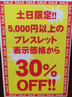 JUGEMテーマ:セール・お買い得・福袋 こんにちは☆加藤でございます(^∀^)昨日はお休みだったので11日ぶりの晴天!!てこともあり、洗濯、掃除、お買い物を全てやりました(゜∀゜)大満足しましたねさて今回はこちら!!!土日限定のイベントでございます(゜∀゜)5000円以上のブレスがなんと30%offになります!!!そしてそして、、、\本日のイベント情報/<サマーセール>今回のセールはネックレス、リング、さらに雑貨も赤い○シールが貼ってあるものは半額になっちゃいます!!!<宇宙フェア>今月もやってま...