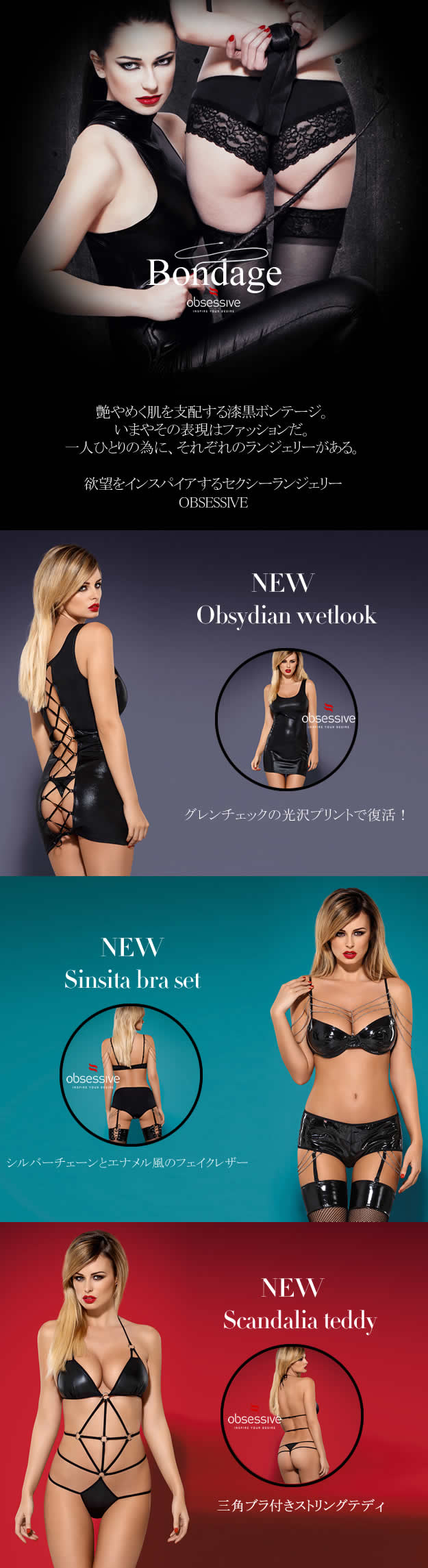 SMの女王様をイメージさせるボンデージ。 いまや限られた一部の人だけの愉しみではありません。 ボンデージ誰でも気軽に愉しめるファッションへと進化しています。 本日発売されたオブセッシブの新作コレクションは まさにファッションとして楽しめるボンデージ・ランジェリー。 ひとたび身に身に纏えば、誰でも簡単にボンデージ気分を味わえます。 ボンデージは表現するファッションへ―。 オブセッシブが提案するボンデージファッションを、どうぞお楽しみください。 https://...