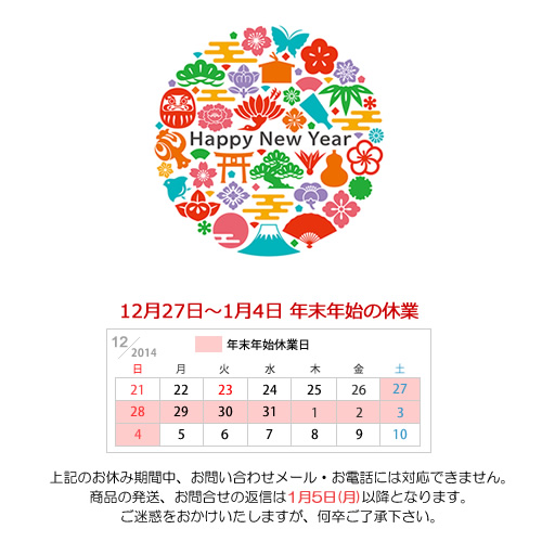お客様へ 本年もありがとうございました。 今年の営業も本日26日で終了とさせていただきます。 誠に勝手ながら、下記の期間はお休みさせていただきます。 12月27日(土)から1月4日(日) 新年は1月5日(月)より通常営業とさせていただきます。 【ご入金の確認について】 ・12/26 (金)午後15:00までのご入金 → 12/26(金)に発送します。 ・12/26 (金)午後15:00以降のご入金 → 1/5(月)以降、順次発送します。 以上、お手続きよろしくお願い致します。 【コンビニ後払い審査について】 ・12/26 ...