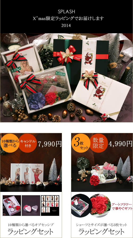 JUGEMテーマ:下着・ランジェリー こんにちは、アヴァンサのユウです。 今年もいよいよ冬の訪れを感じる季節となりましたね。 さてSPLASHは今年のクリスマスを盛り上げるスペシャルアイテムをご用意いたしました。 どれも数量限定の特別アイテムはラッピングも無料、もちろん送料も無料! 是非、ご利用ください。 クリスマスを盛り上げるランジェリープレゼントは是非、こちらをご覧ください。