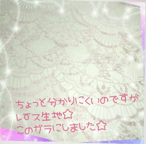 チラッと♪ ちょっと分かりにくいのですがレース生地☆ この柄にしました☆ 出来上がりが楽しみです♪ ブログランキングに参加しています。クリックして応援よろしくお願いします。 にほんブログ村 FC2 Blog Ranking JUGEMテーマ:ロリィタ