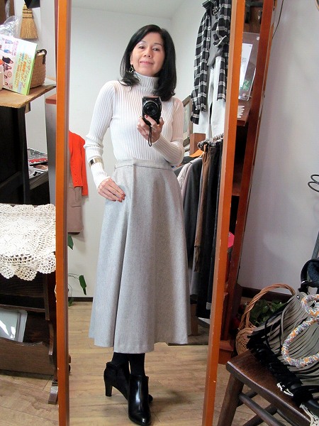 JUGEMテーマ:本日のおすすめ 160cmの私でも76cm丈のロングフレアーはOK ネットショップのお客様モデルrisaさんは166cmと6cmの差があっても 重くなく、きれいにフレアーが出ていますね♪ そんな綺麗なシルエットを生かしてのコーデ達で〜す!!! 今シーズンも大人気、注文殺到の マリードールのリブニット、タートルタイプ着用♪ 白色は、マイナス10歳と言いたいところだけど、マイナス5歳見え!!! ライトグレーのスカートと、...
