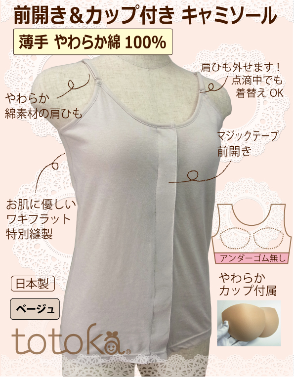 入院・術後・介護に薄手やわらかライトベージュ前開きワンタッチ肌着キャミソール【優しい肩ひも&ワキフラット】トトカオリジナル JUGEMテーマ:レディースインナー たまかずら 様 ★★★★★ 御社の商品を利用されているのは、どういった方が多いのでしょうか…。 私は、肺ガン患者です。今年の3月に手術を受け、今は、抗ガン剤治療を受けています。術後、肋間神経痛でブラをつけることが出来なくなりました。みぞおちの辺りからオッパイの下半分、脇近くにかけて痛いのです。術後、三ヶ月程はパ...