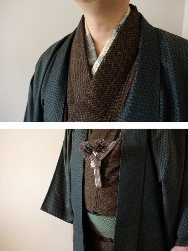前回書きました「新春美術館めぐり」。今回はそのときのコーディネイト記録を〜 相方は、祖父の青緑にベージュの柄のアンサンブルに、tentoさんのモスグリーン帯。 柄はとても素敵なのに、貝の口がキャンディ状になる柔らかいこの帯は、アンサンブルの季節にこそ活躍させたい一本。羽織紐は毎度お馴染みの銀鼠。過去の記事を見たらこの組み合わせ、前回このキモノを着たときと同じでした。 新春らしく、半衿は紅型調の端切れ。今回はなぜかちょっとしか出ていませんが、落ち着いた色合いで梅や桜、鳥などが描かれています。 ち...