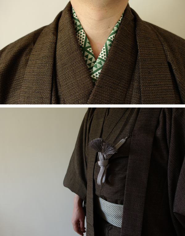 今回は、前回書けなかった、結婚記念日ディナー@上野韻松亭の日のコーディネイトをば。 今でこそ割と勢いよく着ていますが、今年の前半はほとんどキモノを着ていなかったので、この日は今年の袷はじめでした。 相方は、渋い色合いの柄入りの紬。青緑っぽい地色にベージュの柄ですが、光の具合で全体的に淡く見えますね。 このキモノ、実は私の祖父がその昔着ていたもの。(メインサイト内記事→「祖父の着物」) この記事を書いた後、とりあえず目立つしみのあるものはしみ抜きに出し、状態のよかったこのキモノは、羽織と...