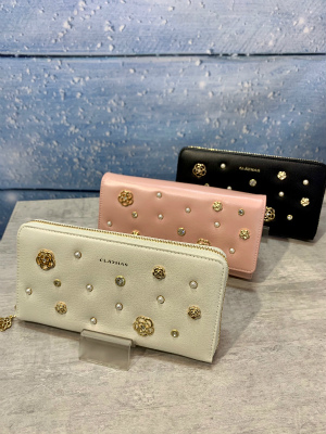 JUGEMテーマ:バッグ・財布★大好き ラメ加工の革にキラキラとかわいいビジューが付いた 華やかで上品なお財布シリーズ。 パールやクリスタル、ゴールドのお花など 光輝くビジューがいっぱいです。 ピンクとアイボリー色は、パール加工もされています。 ・定番の使いやすいかぶせ長財布(写真・左側) ・カード収納と見開きがよく、出し入れしやすいラウンド財布(写真・右側) お揃いのバッグもあり、...