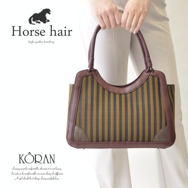 JUGEMテーマ:オシャレ★大好き ☆キレイなコントラストが魅力のホースヘアハンドバッグ https://store.shopping.yahoo.co.jp/koran/horsehair-bag-12.html 色:ブラウン 価格:18,900円 真面目で可愛いデザインバッグ 馬のたてがみを織り込んで仕立てたホースヘアのハンドバッグ ストライプ柄にバーガンディな縁やハンドルが綺麗なコントラスト 入学式や卒業式のスーツに合わせるシーンからカジュアルまで幅広く使えます