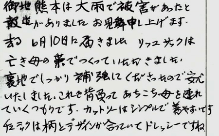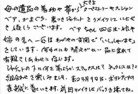 私は基本的に終業後ブログを書くようにしています。(独立時は朝一でブログを書いていましたがいつしかスタイルが変わりました。)出来る限り毎日書きたいと思っていますが、日によっては一日バタバタしていればしんどい時もあります。今日なんかはそんな一日なのですが、そういう日は私はお客様に頂いたメールやハガキをご紹介する様にしています。着物リメイクをお考えの方には生の声として参考になると思いますし、私にとっては元気になれるカンフル剤のような力になります。今日ご紹介させて頂くのは納品後頂いた当店の着物リメイ...