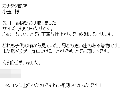 今日は私達「カナタツ商店」の着物リメイクを ご利用下さったお客様から頂いたご感想のメールをご紹介致します。 実際に私達の着物リメイクをご利用下さったお客様からのレビューとして 現在着物リメイクを検討されている方などは是非参考になさって下さい。 まずは、東京のお客様に納品させて頂いた着物リメイクの服に関するご感想です。 テレビ東京の「ナンカゲツマチ」出演情報が上手く伝達できていなかったことを 反省しつつも着物リメイクへのは御満足頂けた事が嬉しかったです。 『どれも子供の頃か...