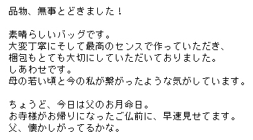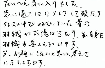 JUGEMテーマ:着物リメイク/古布リフォーム/裂き織り久しぶりにやりました…。「投稿」ボタンを押して書き上げた記事をアップしたら…変な画面になって「??????」…記事が無い…orzこの脱力感…(泣)という事で私達の宝物と言っていい着物リメイク納品後にお客様に頂いたご感想を三件ご紹介します。三枚目のご感想ではがま口の件でご指摘を頂いたので、早速当店でも検証して対策を取りたいと思います。こういうご感想も本当に有難いです。(ちなみにこのお客様からはリピートのご相談を頂いています。 ご満足は頂けたようでホッと...