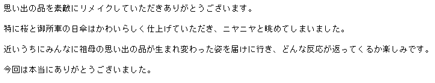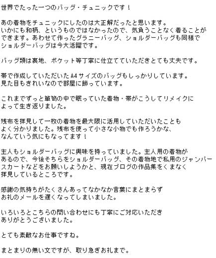 JUGEMテーマ:着物リメイク/古布リフォーム/裂き織り母の日も昨日終了…まとまった荷物の出荷も完了して今日は一段落でブログを書きます。忙しいのは有難い事と思いながらさすがに少々疲れました…(笑)こんな時は元気になれるお客様からのご感想と着物リメイク製作実例をご紹介します。『…(前略)…思い出の品を素敵にリメイクしていただきありがとうございます。 特に桜と御所車の日傘はかわいらしく仕上げていただき、ニヤニヤと眺めてしまいました。 近いうちにみんなに祖母の思い出の品が生まれ変わった姿を届けに行き...