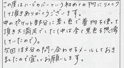 JUGEMテーマ:着物リメイク/古布リフォーム/裂き織り本来は昨日少し長めの前置きでこのブログを綴ろうと思っていたのですが、私用でバタバタとしてしまい、前置きは無しで綴りたいと思います。今日は私が最も好きなトピック…お客様の声のご紹介です。先日のブログで2回目は難しい…という着物リメイクに関して綴りましたが(この商品ですが…)このブックカバー他を納品させて頂いたお客様に頂いたお葉書です。内側にも残布を使って製作したのを評価して頂き細かいポイントも見て下さることが嬉しかったです。芯選びは少し大変でした...
