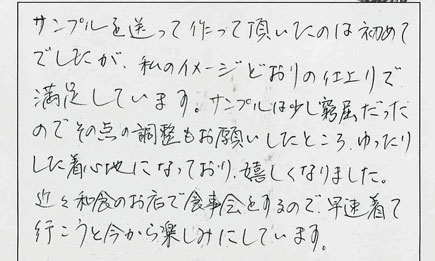 JUGEMテーマ:着物リメイク/古布リフォーム/裂き織り本日から新年度!ついに消費税増税ですね…。先ほどスーパーマーケットに行きましたが昨日まではごった返していた店内も今日は閑散としています。時代の微妙な転換期…と、そんな気がする今年じゃないですか?4月1日、当店も次の消費税増税を睨んで外税方式を取り入れました。さて、新年度一回目のブログですので私が個人で好きなトピックであるお客様の声をご紹介します。リピーターのお客様からのご感想ですがサンプルのスーツをお借りしてリメイクをさせて頂きました。お借りし...