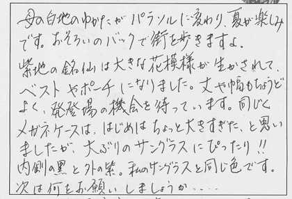 JUGEMテーマ:着物リメイク/古布リフォーム/裂き織り最近FMなどを流しているとよく聞く音楽ですね。良い意味で素晴らしき才能の無駄使いだと思います。さて今日は着物リメイクをご利用いただいたお客様のご感想ですが、ご新規の方とリピーターの方のご感想をご紹介します。ご新規の方の着物リメイクのご感想です。白地の夏のお着物のリメイクをさせて頂いた日傘やバッグなどは後日に当ブログでご紹介したいと思います。リピーターの方の着物リメイクのご感想です。この方のリメイクご相談の案件のお着物は毎回生地がとても良く製作...