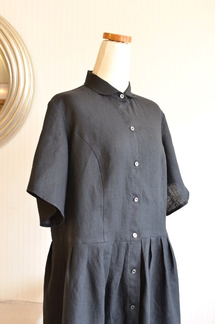 オーダーの作品です。 "フレンチリネン40's black" で、ゆったりとしたワンピース。 普段着でも、少しフォーマルでも着られると思います。 袖は二の腕が隠れるくらいの4分袖くらい。 涼しく少しワイドな袖になっています。 全体のバランスはこんな感じ。 スカート部分はボリュームはありますが、タックがたたんであるのでストンと落ち着いたラインです。 ボタンを開けて、カーディガン風に...