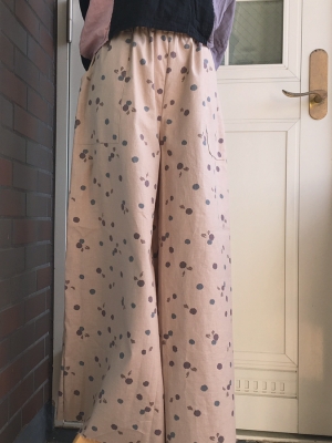 チビの私は一度も経験ないのですが、 背の高い友達は 、 「パンツ丈が足りない」 と言うんです。 う、うらやましーい。 そういう人のために、 パンツの裾始末をしないで置いてます。 好きな長さで仕上げますよ。 ながーっ。 148cmの私だと、引きずる長さです。 水玉だけど幼い感じではなく、 柔らかくストンと落ちる素材です。 ポケットは両側についています。 縫い代はもちろん ...
