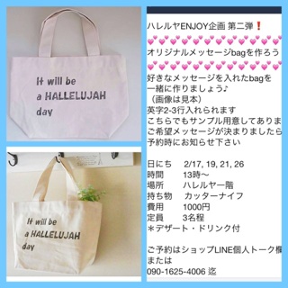 一緒にメッセージバックを作りましょうカッコいいメッセージ入りのオリジナリティーあふれるバックを作って楽しみましょう※2/17は定員となりましたお問い合わせは090−1625−4006またはショップLINE迄・JUGEMテーマ:ナチュラル☆ファッション