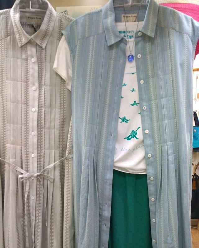 セールアイテムからご紹介 peopletreeの手織ワンピースはしっかりしたドビー織のストライプ。 そのまま着てもすっきり素敵ですが、前あきなので、羽織りにもおすすめ! 特別価格!ですよー。 コーデはこちら↓ かわいいウミガメのエコアートのTシャツ(peopletree) ぴったりな色合いのコットンピケのスカート(シサムコウボウ) こちらもちょっぴり、sale価格です。 アクセサリーは、竹原裕子さんの夏色ガラスネックレス。 涼しいブルーがかわいい! ぜひ、合わせに来てください...