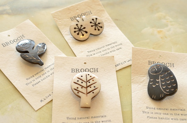 水牛の骨を1つ1つ手彫りでつくったブローチ 洋服やバッグのアクセントにオススメです 【おはな、とり、ちょうちょ、木、ふくろう】 全てアイボリーとブラックの2色 ひとつひとつ手作りなので、デザインや色の出方が異なります。 サイズ:2.7×3.8cm 素材:水牛の骨 ¥800+税 ********* 今週も土曜日まで休まず営業(11時〜17時)です。 12日(金)は、10時30分〜14時30分の営業となります。 よろしくお願いいたします。 ...