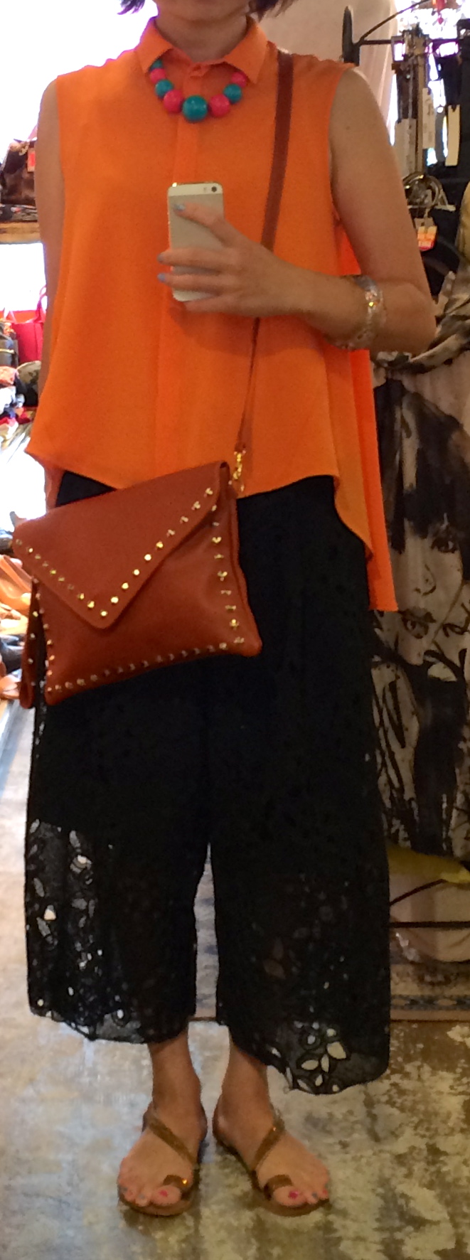 JUGEMテーマ:コーディネート ブラウス 13800円(ITALY) レースワイドパンツ (今季完売商品) ネックレス 6900円(ITALY) イヤリング 3900円(FRANCE) スワロバングル 15800円 BAG 15800円(ITALY) サンダル 16800円→期間限定50%OFF Aラインで涼しいです ※色違いのベージュは売り切れました アクセサリーはオレン...