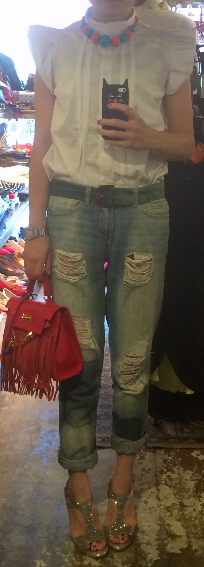 JUGEMテーマ:コーディネート 今日はダメージデニム×フリルシャツ フリルシャツ 13800円(ITALY) デニム 19800円(ITALY) ネックレス 6900円(ITALY) イヤリング 5900円(FRANCE) ベルト (vintage) BAG 19800円(ITALY) サンダル 28000円(ITALY) 肩のフリルデザインは腕が細く見える効果ありです ※在庫残りわずか ダメージ部分のおかげで涼しく履けます 今日のアクセ達は明日からの島旅行にも連れて行きます 今季はデニムにはコレです☆ ※在庫サイズ38のみです ...