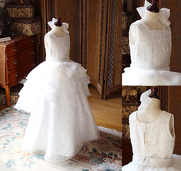 豪華なリバレースをスカートに使用した”ピアノの受賞者コンサート用ドレス”! 島根県の小学生にドレスを制作させて頂いたドレスです。 126cmサイズのロングドレスです。オフホワイトカラーを基調に”レース使いが特徴的なロングドレス”! 左右非対称デザイン!ティアード スカートのオーバースカートが施されたドレスです。レースや刺繍レースがお好きな方にオススメするドレスデザインです。ピアノのコンペティションやコンサート、コンクールに最適な素敵なドレス。 オフホワイトカラー...