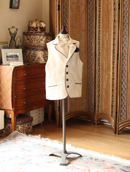 ピアノを演奏する小学生の男の子に制作をさせて頂いた”ベストとタイ”! シャンパンカラーとネイビーのパイピングを施したデザインです。 毎年、ご注文を頂いているお客様のお衣装です。 ピアノのコンサートや演奏会に着るためのお衣装です。 通常の着丈よりも長い設定となります。ノッチよりの襟元と優しいカーブを取り入れた襟元のデザイン。ジャガード素材のシャンパンカラーとネイビーカラーの相性がバッチリ。お子様の表情を素敵に演出する衣装です。 リボンとボウタイ...